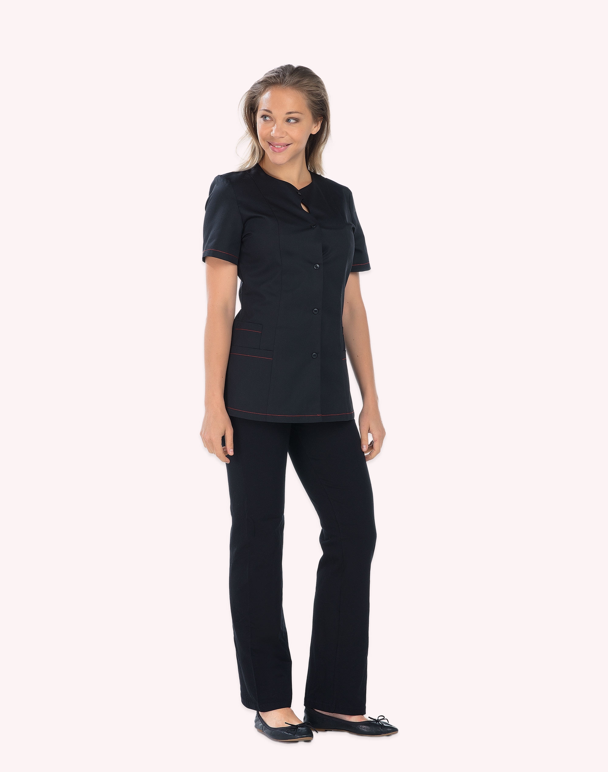 Tunique femme, manches courtes, coupe ajustée, fermeture par pressions, 2 poches basses, 2 poches BIP, fentes côtés, longueur 70 cm