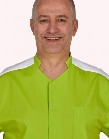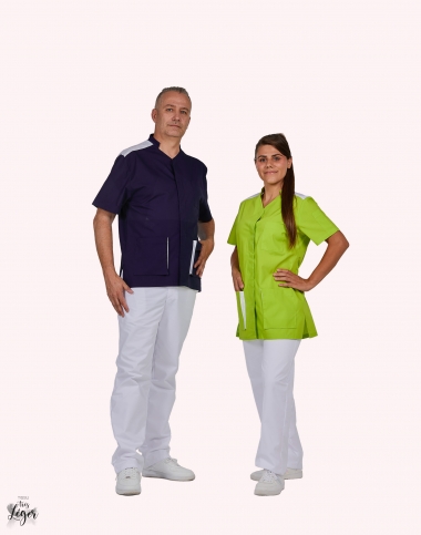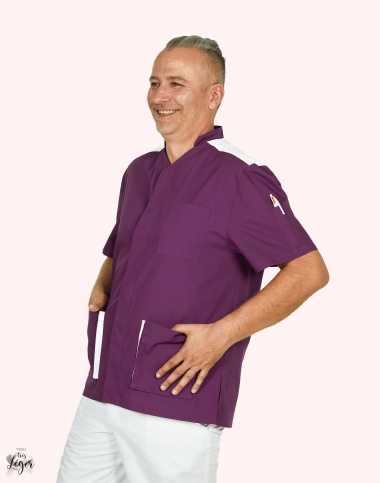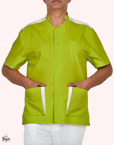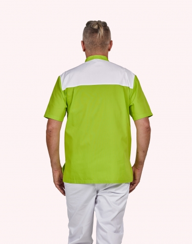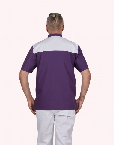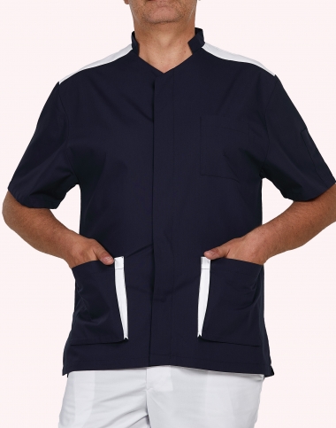 Tunique homme, manches courtes, fermeture centrale par pressions sous patte, 2 poches basses à soufflet, 1 poche poitrine, 1 poche stylo sur manche gauche, fentes cotés, longueur 78 cm